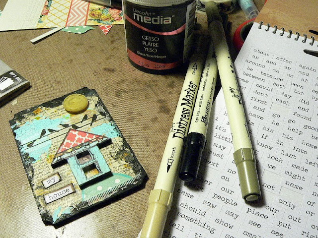 I also added a small vintage portrait before I glued the house in place. Then I added some chit chat stickers and blended them in with Distress markers.