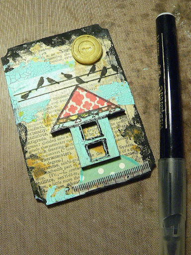 Apply to the ATC by scraping it on with the palette knife. That way you get awesomely looking random shapes! For applying the tinted crackle paint to the house you can either use the palette knife or a small soft brush.