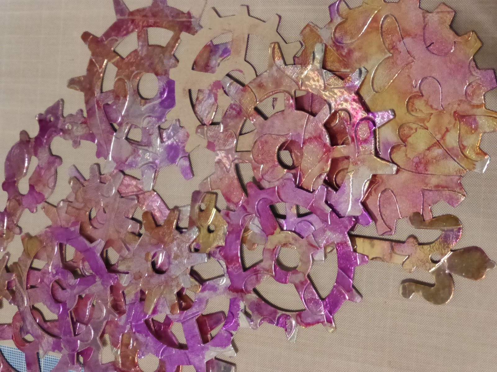 Next, add alcohol inks to the cogs and the frame.