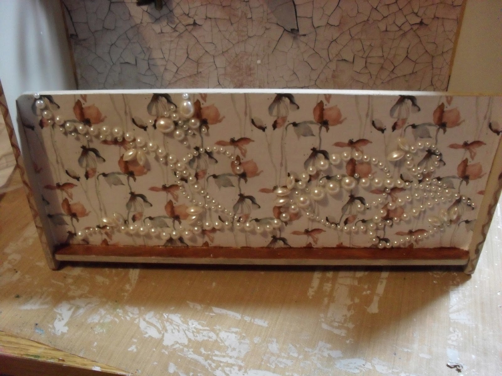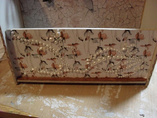 I finished off by getting my husband to drill a couple of small holes in either side and thread through a metal wire which I threaded with pearls from an old necklace. And finished my centre circle with a strip of pearls around the outside.
