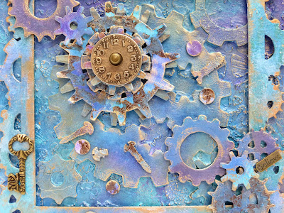 Next glue the piece with the image down and then begin layering up the die cuts and the Paper & Resin Flowers.